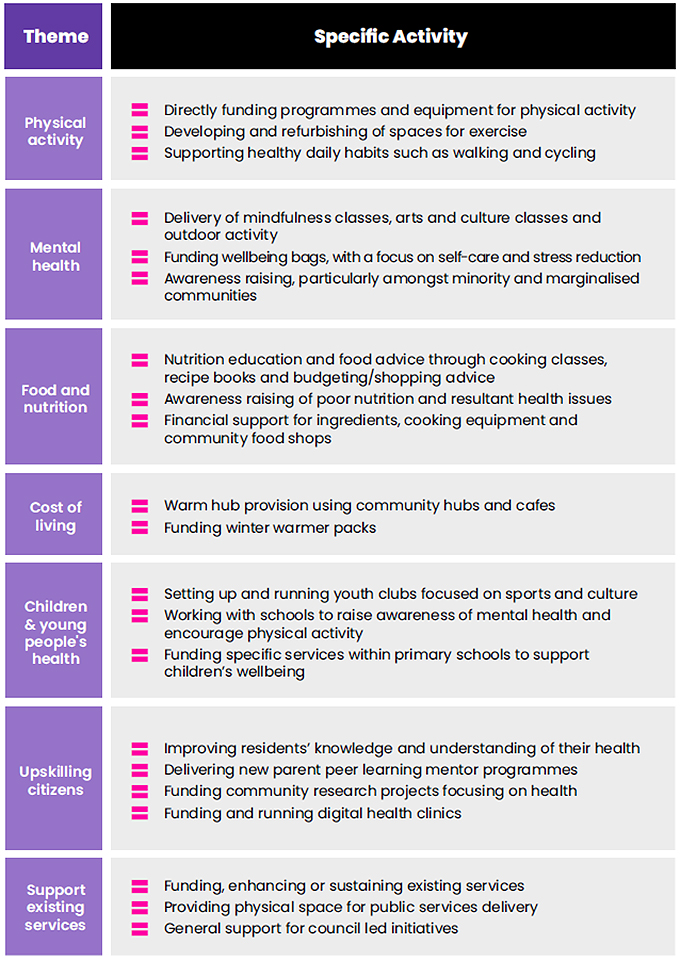Our research found a wide range of activities that we grouped into seven themes. Some meet general ongoing needs such as support for physical activity and good nutrition, and some are clearly shaped by circumstances as they have manifested over the last decade; responding to deteriorating mental wellbeing after the pandemic and the pressures of the cost-of-living crisis. These seven themes and the specific activity within each are presented on the table below: