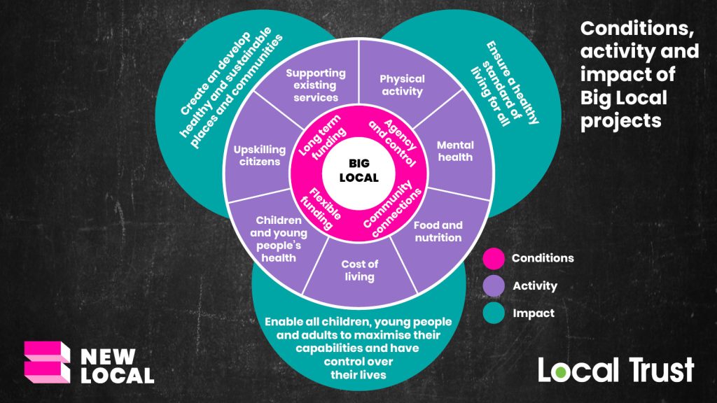 Big Local partnerships have created the conditions for successful community-led health initiatives. Their unique position in understanding the community, placing power and control in the hands of the community, and providing long term and flexible funding enabled a wide range of community-led health activity that has had direct and indirect benefits for health outcomes. This activity and corresponding impact have been delivered despite facing significant institutional barriers.