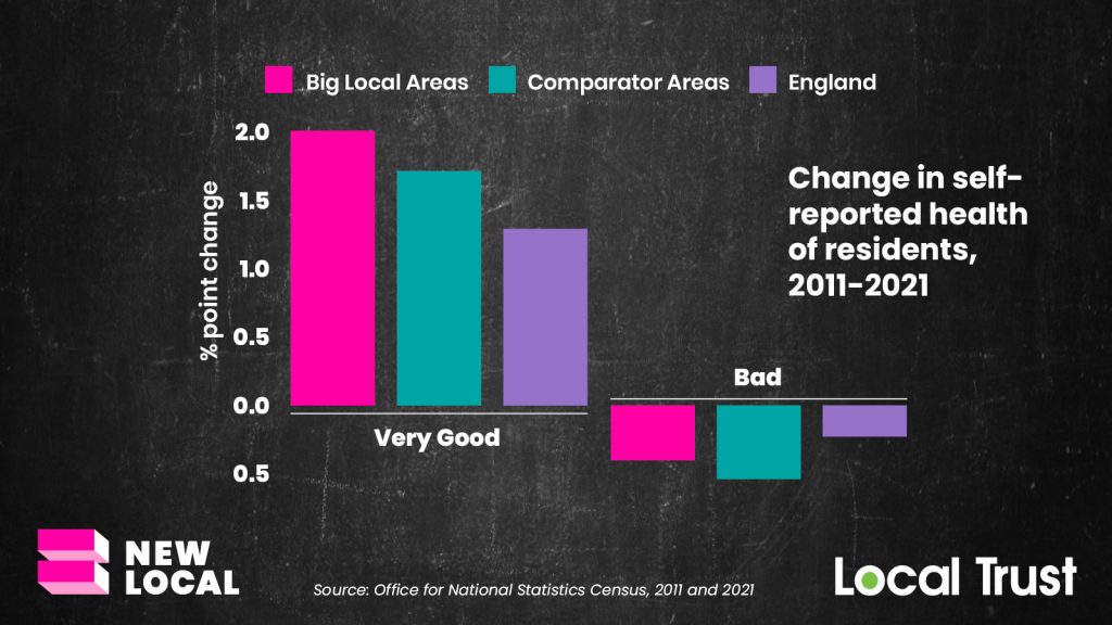 Our research identified important impacts on health and wellbeing. In general, quantitative findings from the census indicate that over the decade of the programme’s operation, the health of residents in Big Local areas was stronger over this period than the rest of the population.